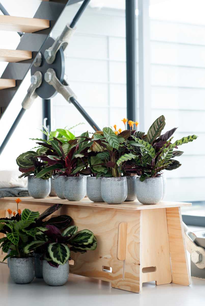 Калатеи разных сортов в больших вазонах как яркий акцент в сдержанном интерьере