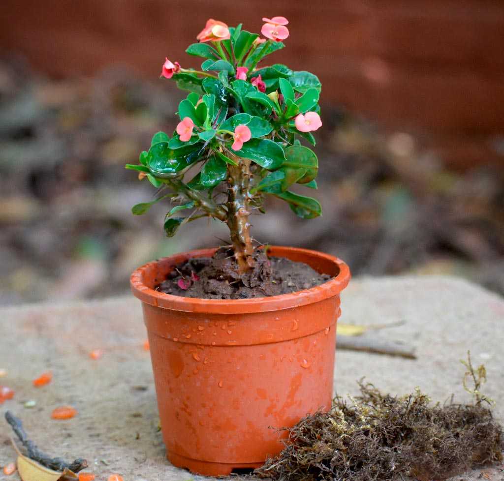 Обратите внимание на то, что на дне горшка обязательно нужно сделать дренажный слой. Во время пересадки молочая диаметр новой емкости должен быть больше старой примерно на 20 мм
