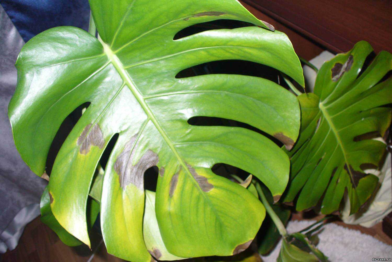 - Появление на листве пятен коричневого цвета. Это ожоги, которые оставляют прямые солнечные лучи при попадании на листовые пластины. Если растение находится на южном подоконнике, то нужно обязательно обеспечить ему притенение от прямых солнечных лучей в полуденное время. Также цветок можно переставить в более затененное место.