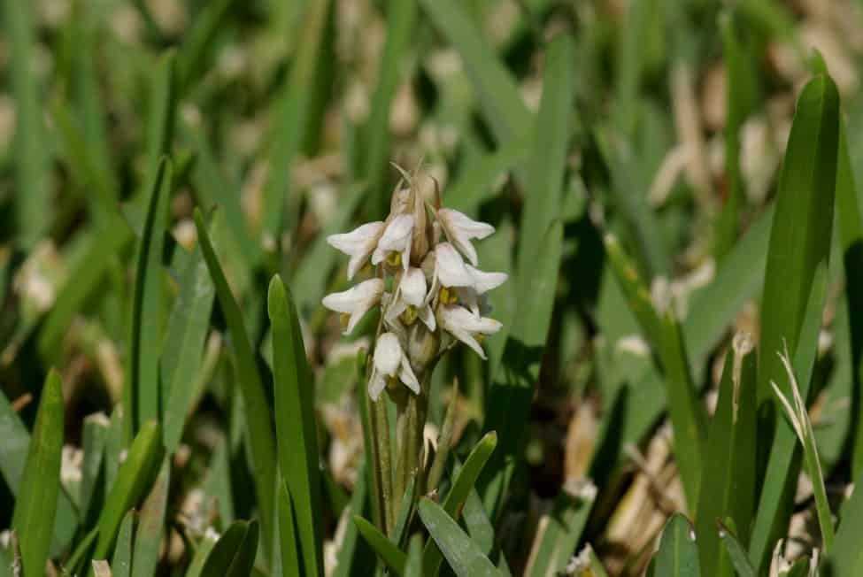 Цветение орхидеи продолжается около 5 недель. Растение выпускает прямой цветонос высотой до 30 см из каждой розетки листьев. Цветёт мелкими цветками белого цвета с венчиком желтоватых тычинок; на каждом цветоносе – до 30 цветков. При цветении орхидея издаёт тонкий аромат и похожа на жемчужное ожерелье.