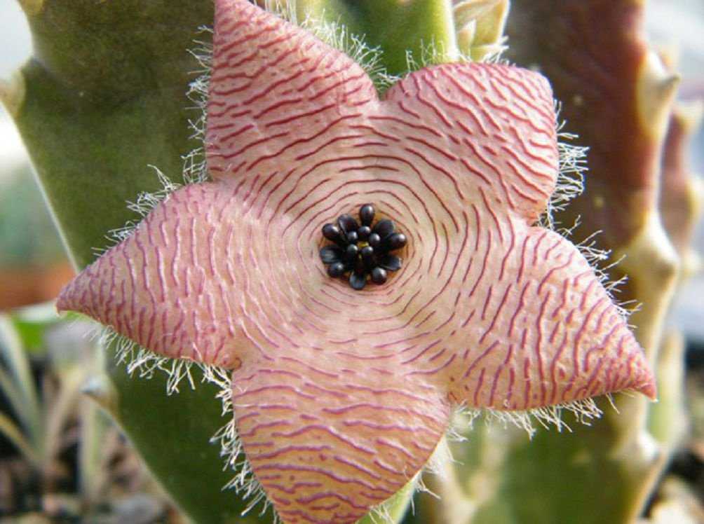 На верхушках цветоножек распускаются крупные пятиконечные цветки диаметром до 30 см. Во время цветения стапелия издает неприятный запах, который привлекает насекомых.