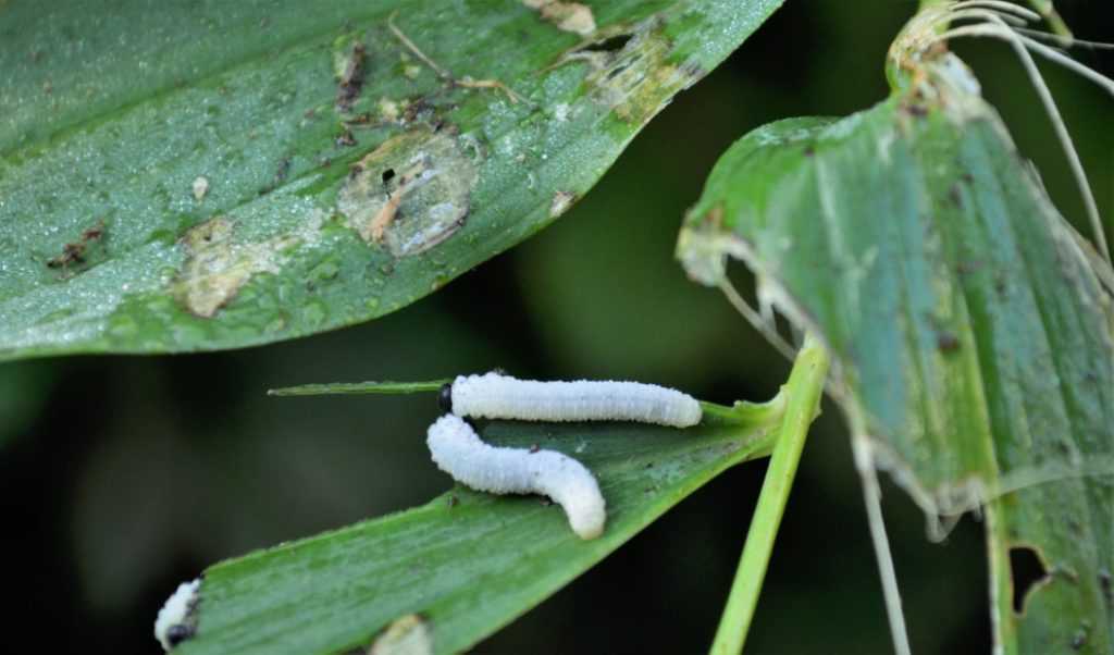 Гусеница — это личинка размерами от 1 мм до 15 см. Наиболее частая причина появления – нахождение фаленопсиса на открытом воздухе несколько дней. На орхидею может сесть любая бабочка и отложить яйца. Из них появляются гусеницы. Как известно, эти вредители отличаются прожорливостью – за считанные дни вся зелень может быть уничтожена.