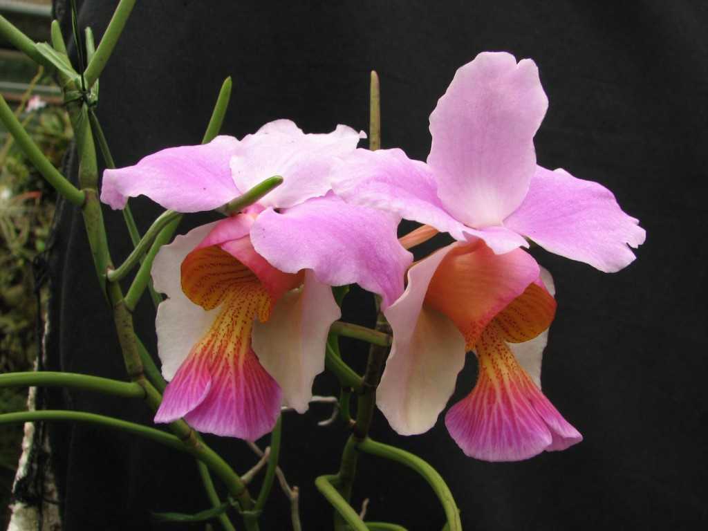 Ванду трехцветную. Этот вид орхидеи вырастает до 1,5 м. На ее длинных цветоносах формируется 7-10 бутонов. Она отличается необычной окраской цветков, которые в диаметре достигают 7 см. Лепестки окрашены в кремовый белый, а губа – в чернильный розовый цвет. Поверхность лепестков усыпана крапинами темно-красного цвета.