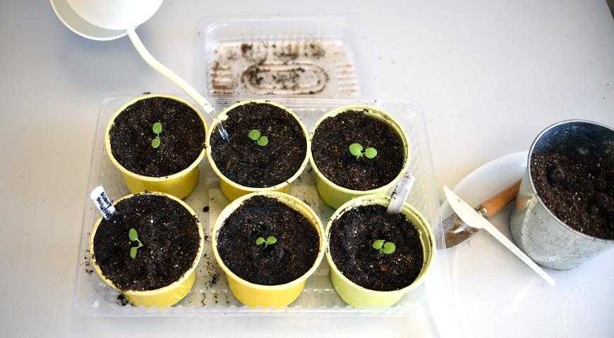 Пикирование рассады проводят, если только она росла в общих ящиках. Для пикировки отбирают стаканчики по 250 мл с отверстиями для дренажа.Когда всходы, будут 5 см в высоту, приступают к пикированию.